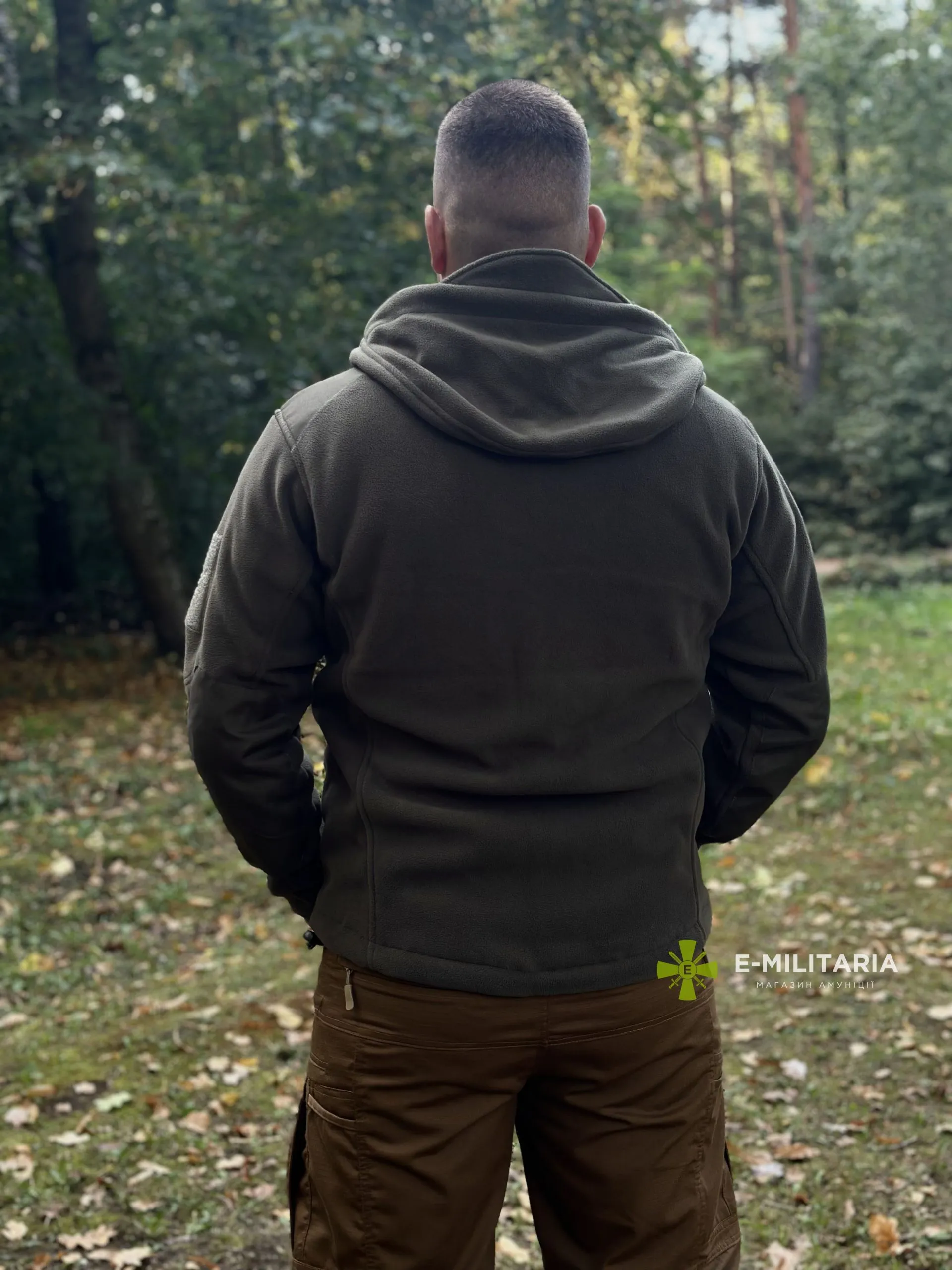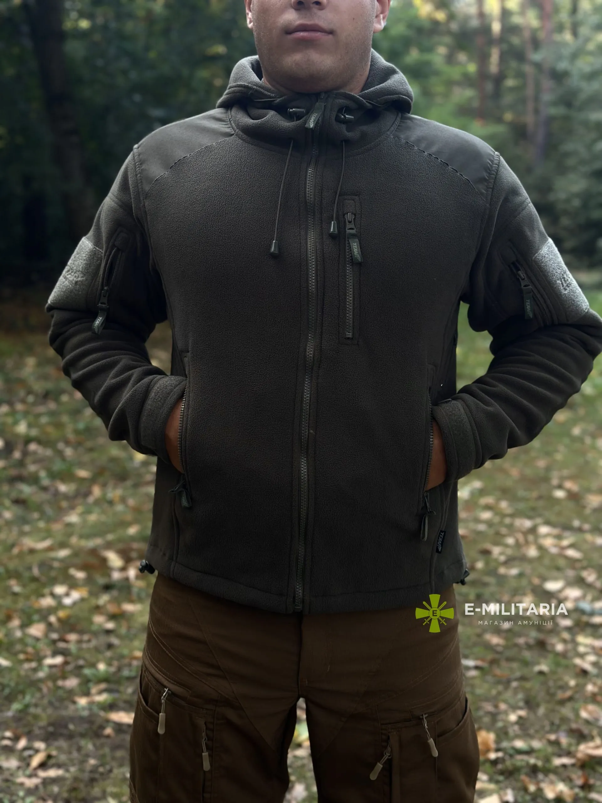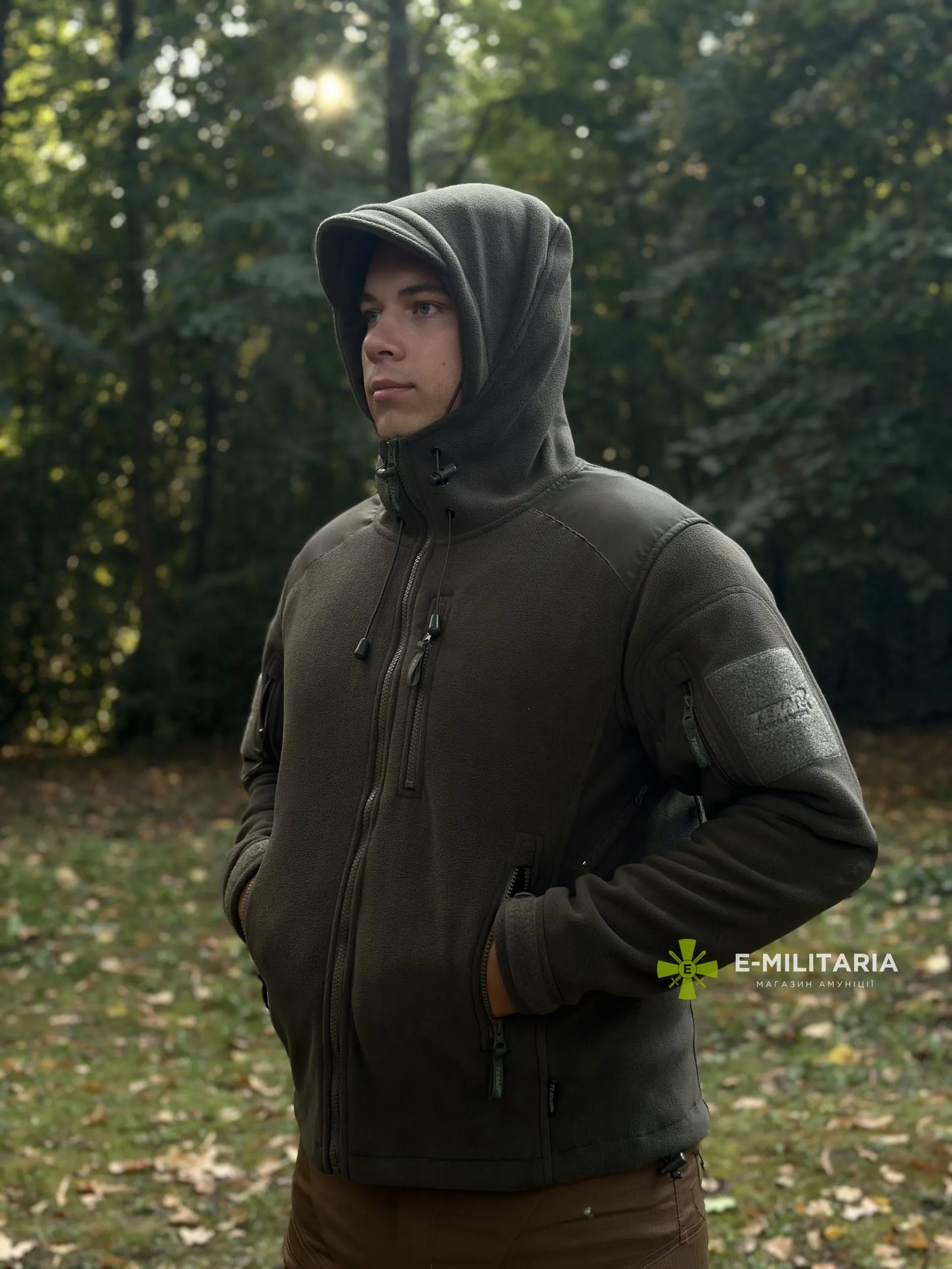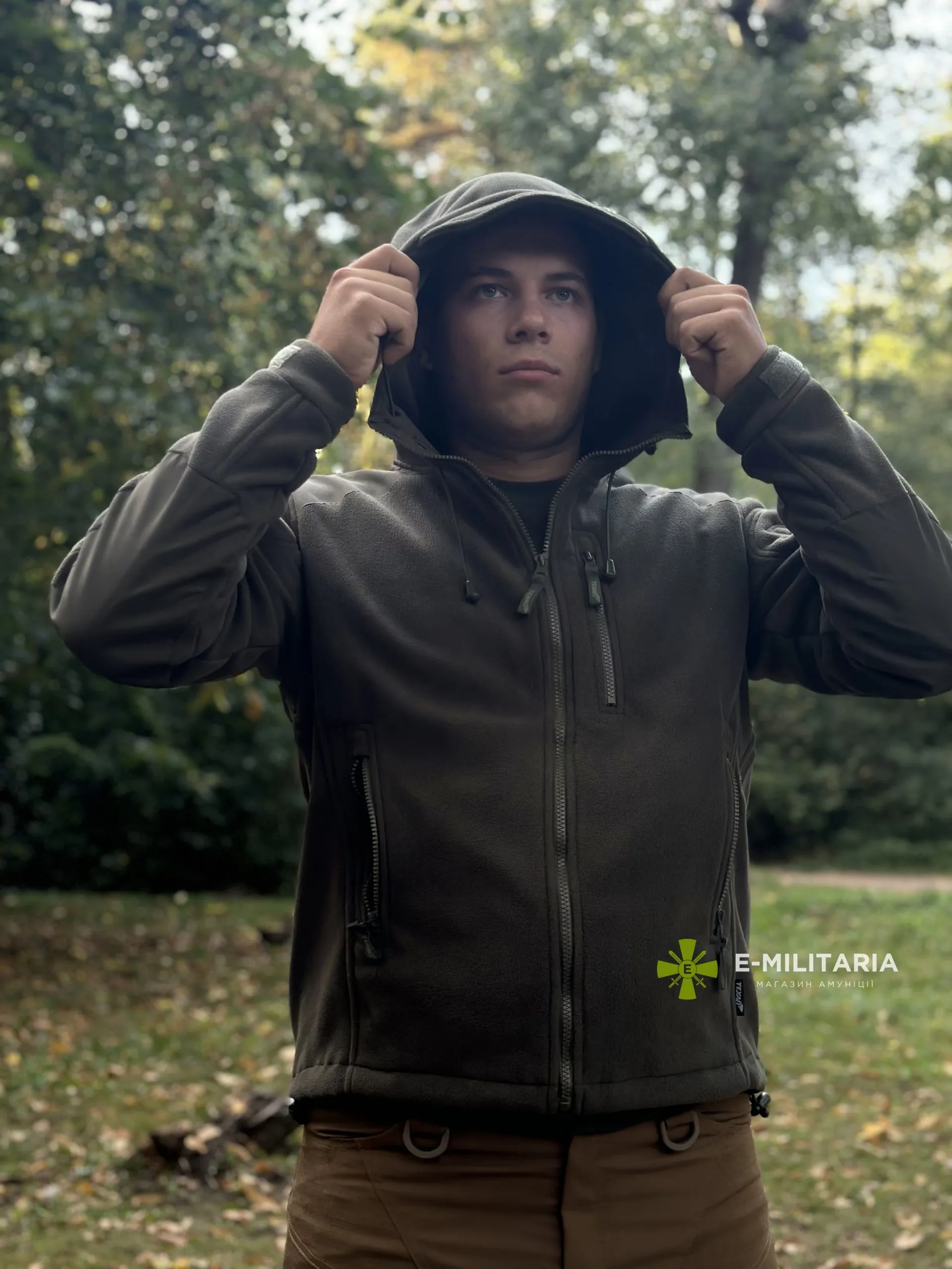 Капюшон досить місткий, щоб надіти його на голову з уже захищеною шапкою. Він оснащений м’яким козирком, який захищає користувача від попадання води прямо на обличчя. Капюшон пришитий до коміра таким чином, що підкладений не відкриває шию. Завдяки цьому користувач захищений від протягу в особливо чутливих місцях. Додатковий захист від потоку повітря забезпечують прорізи в нижній частині флісу.