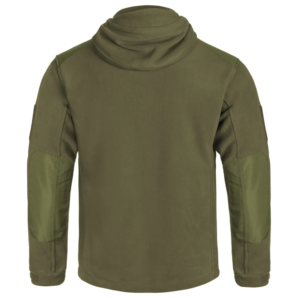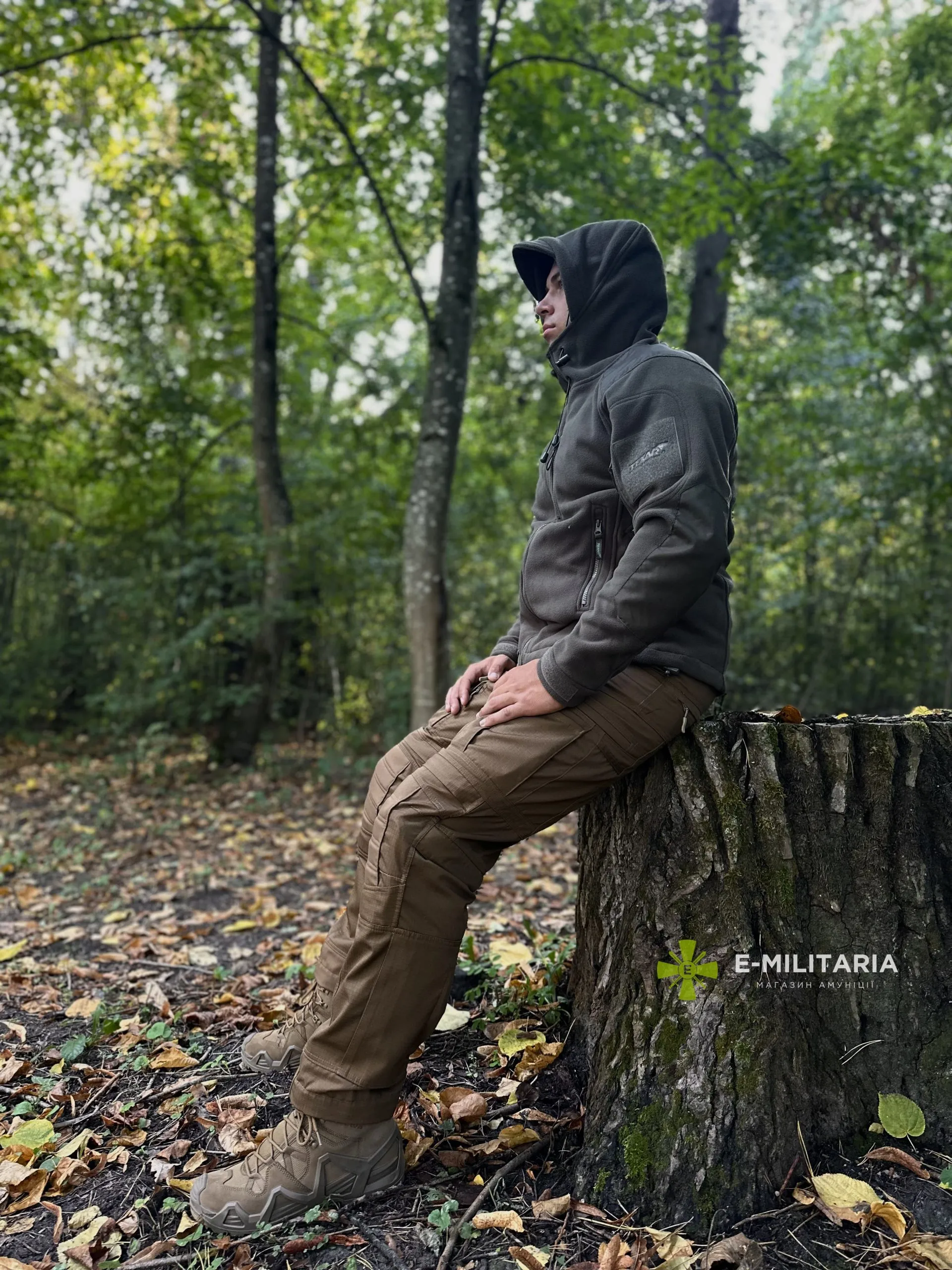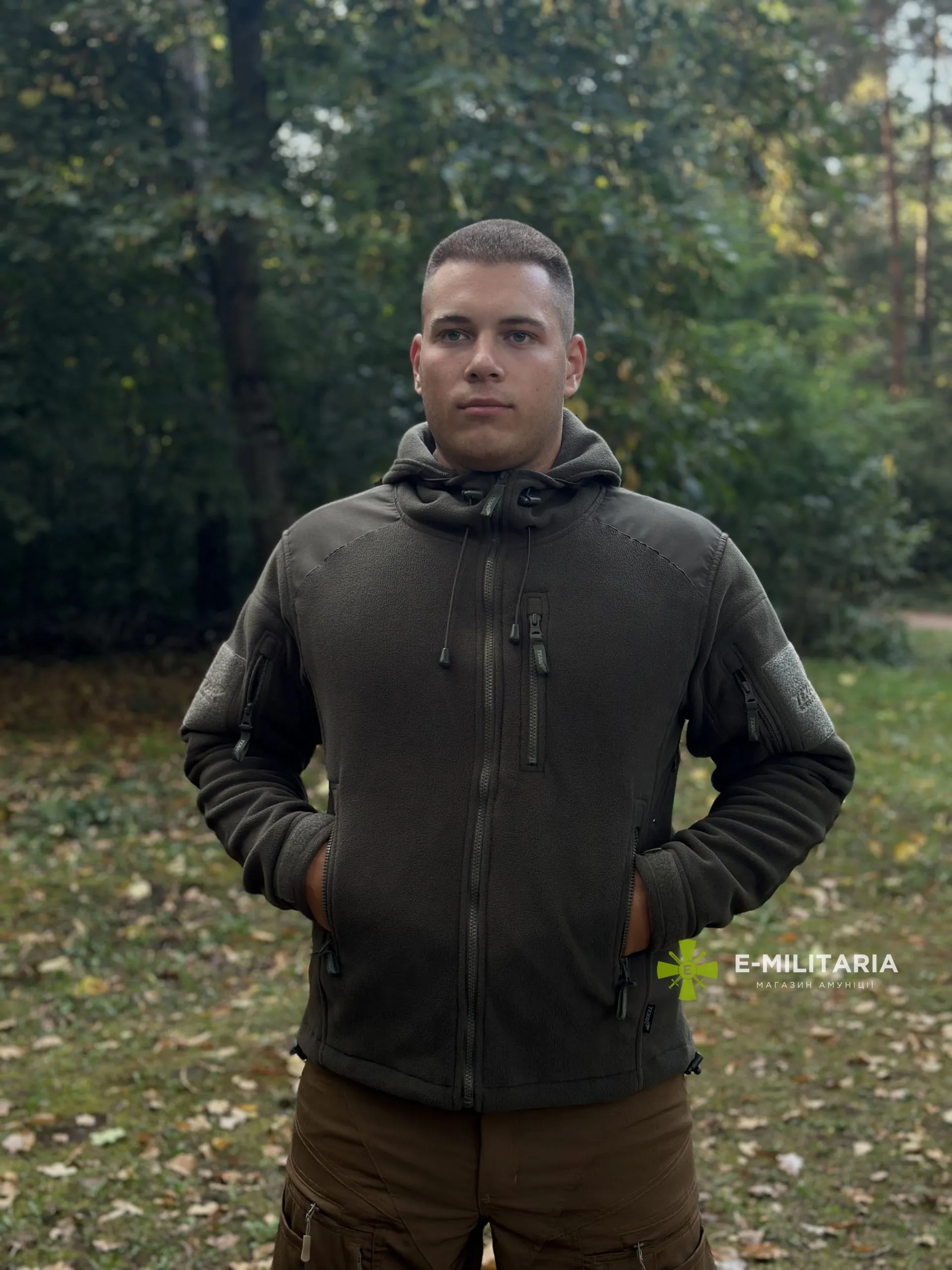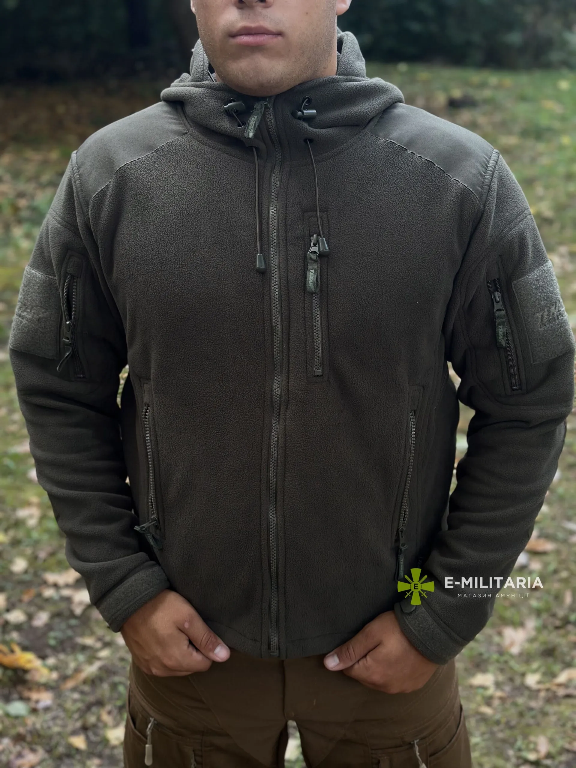 Капюшон досить місткий, щоб надіти його на голову з уже захищеною шапкою. Він оснащений м’яким козирком, який захищає користувача від попадання води прямо на обличчя. Капюшон пришитий до коміра таким чином, що підкладений не відкриває шию. Завдяки цьому користувач захищений від протягу в особливо чутливих місцях. Додатковий захист від потоку повітря забезпечують прорізи в нижній частині флісу.