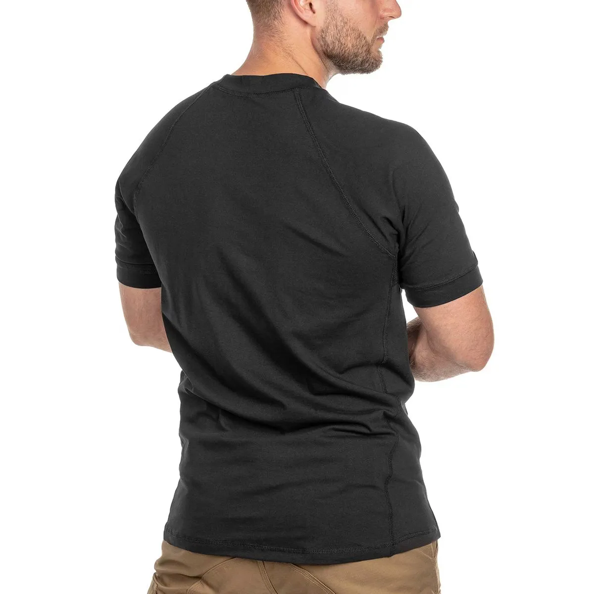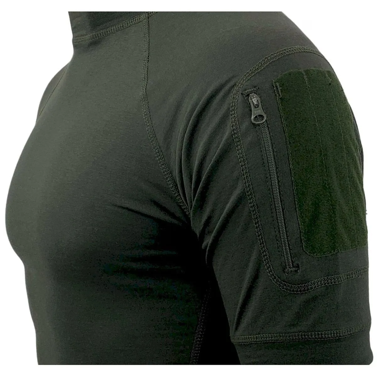 Зручна приталена футболка Texar Duty olive з високим коміром велкро панелью та кишенею на рукаві. Виготовлена з комбінації бавовни та спандекса. Матеріал гнучкий, приємний на дотик, легкий і повітряний. На рукаві вшита невелика кишеня на блискавці від японської фірми YKK. На лівому плечі також є панель-липучка, до якої можна прикріпити шеврон війська чи бригади.