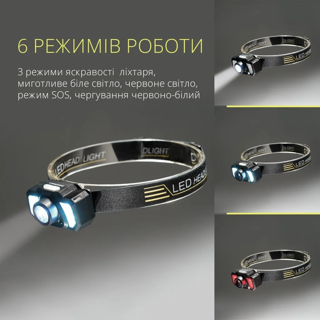 - Має 6 режимів роботи. 3 режими білого світла, червоне світло, червоний миготливий, режим стробоскопа, що перемикаються натисканням на кнопку;