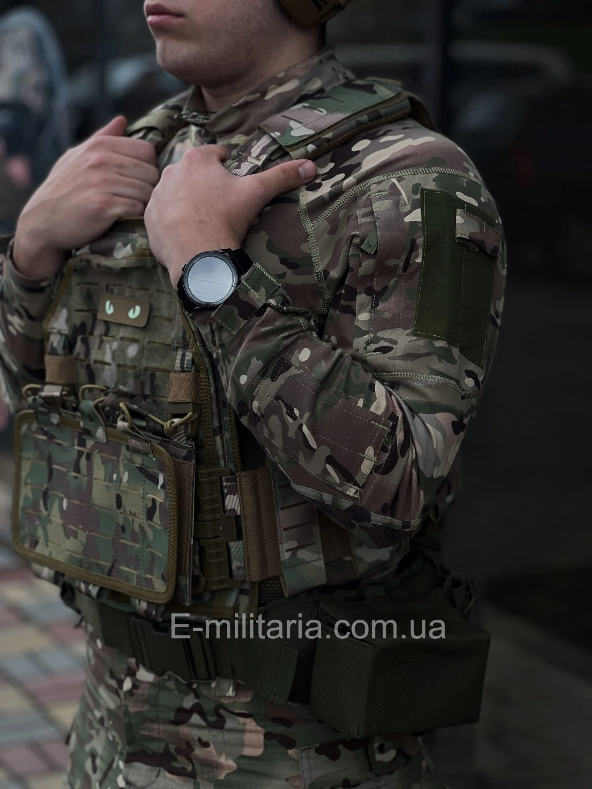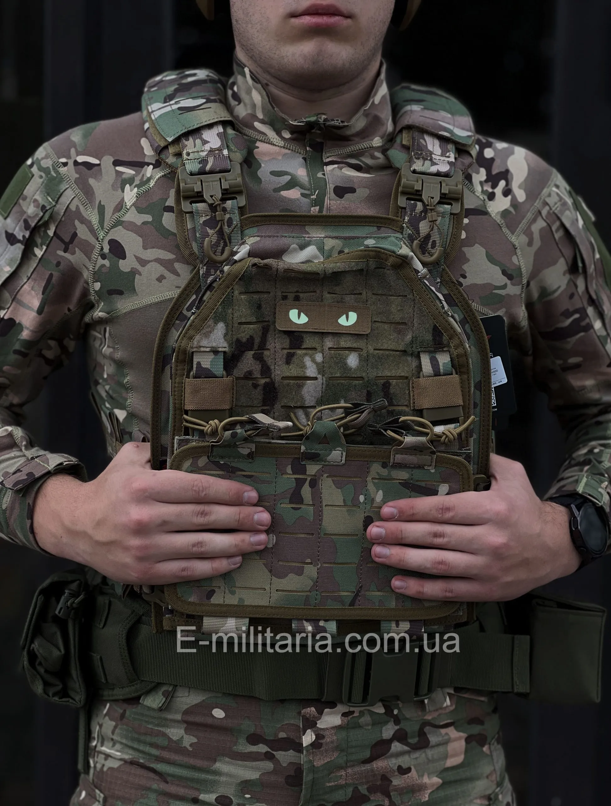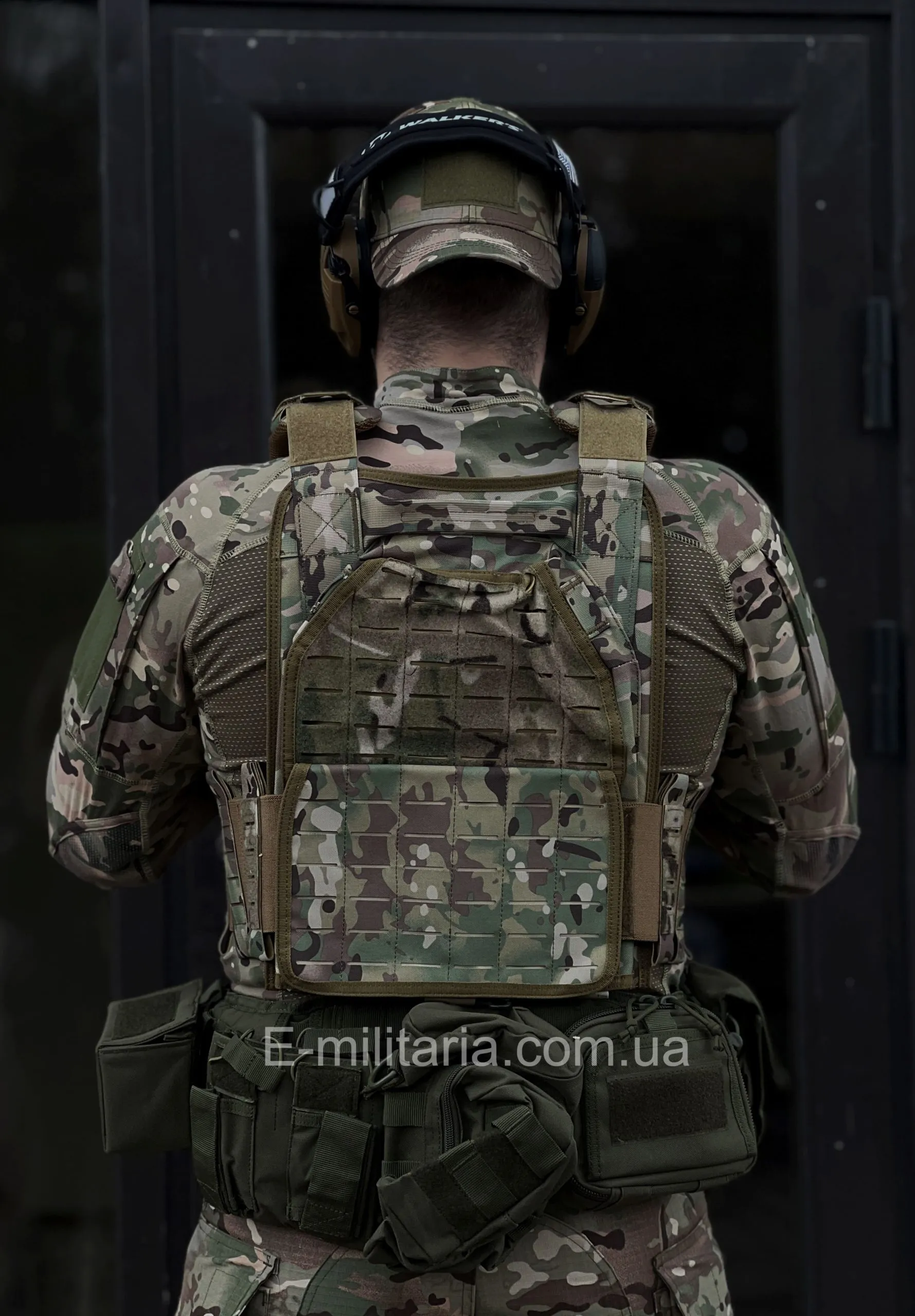 – Интерфейс: Лазерная резка Система MOLLE по всей поверхности жилета, Подсумки под автоматные магазины с системой MOLLE, Эластичный пояс жилета с подсумками.