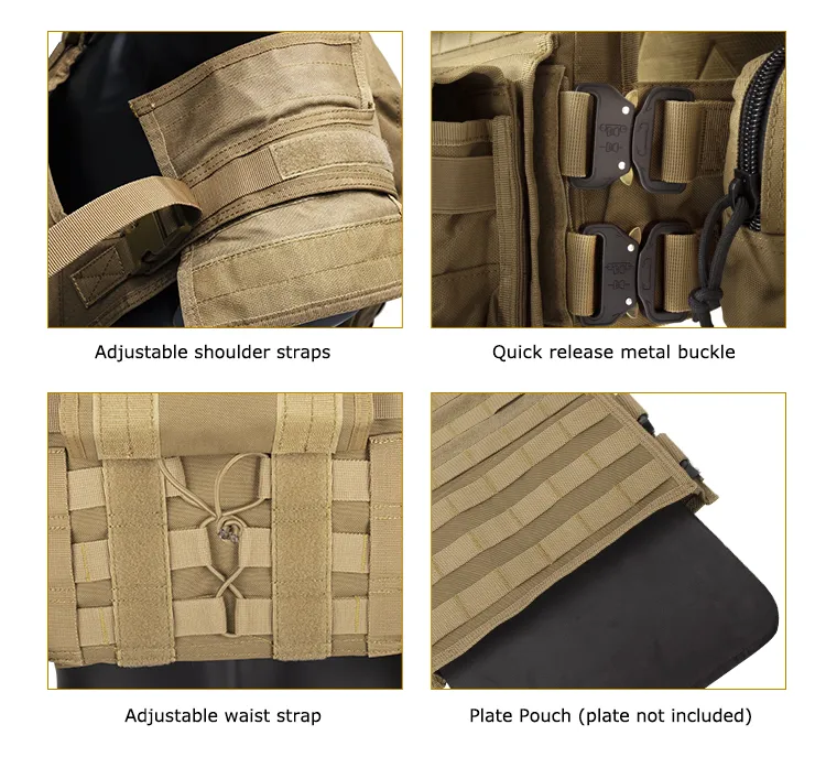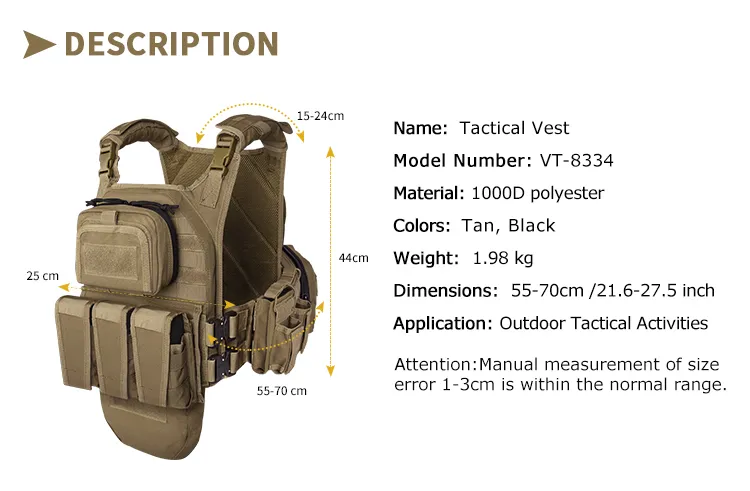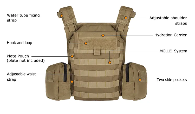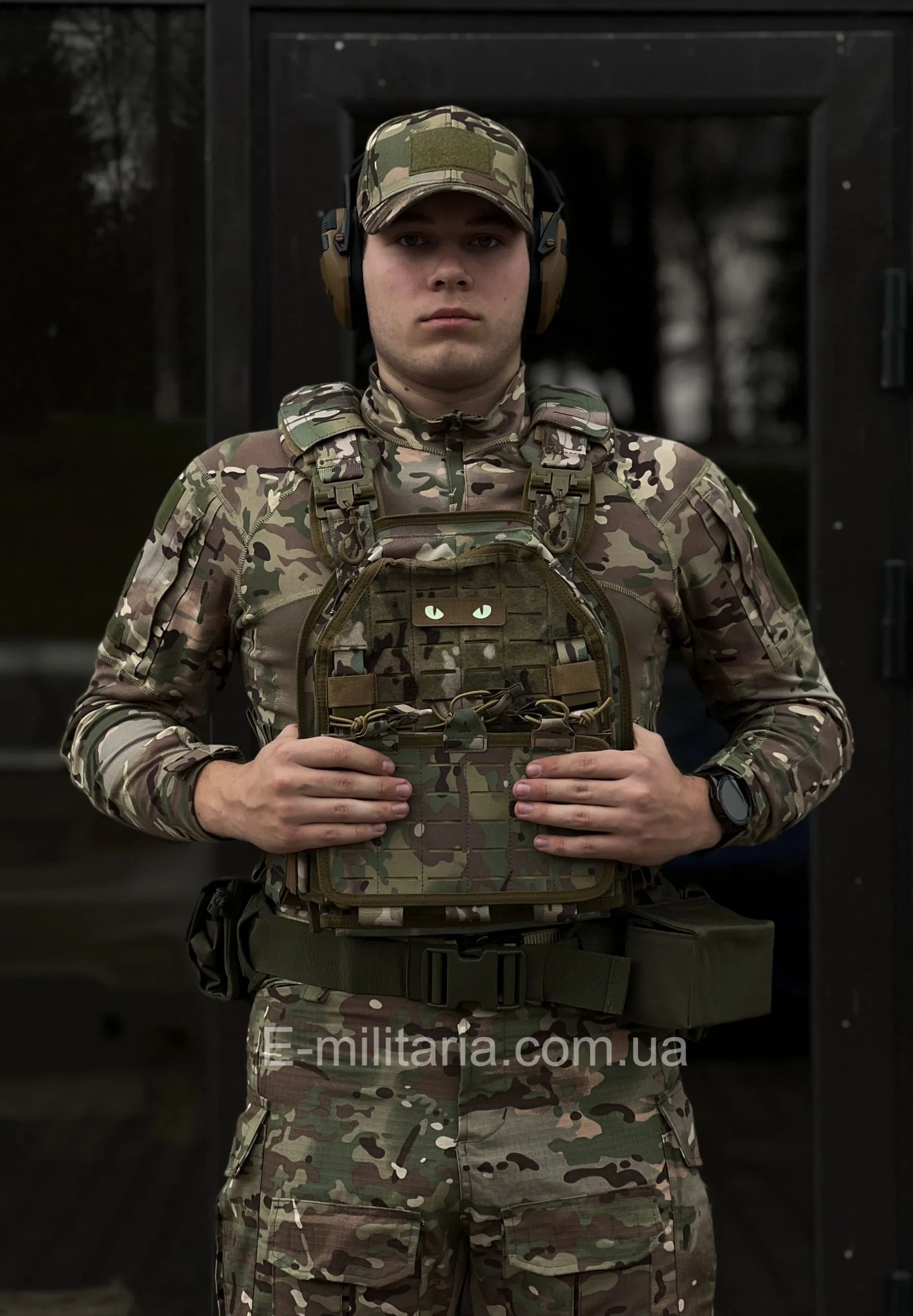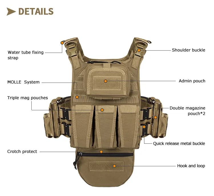– Интерфейс: Лазерная резка Система MOLLE по всей поверхности жилета, Подсумки под автоматные магазины с системой MOLLE, Эластичный пояс жилета с подсумками.